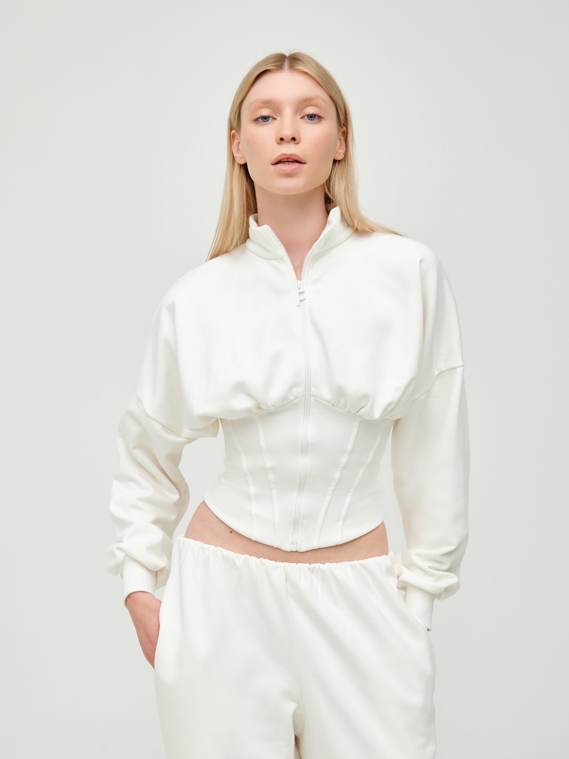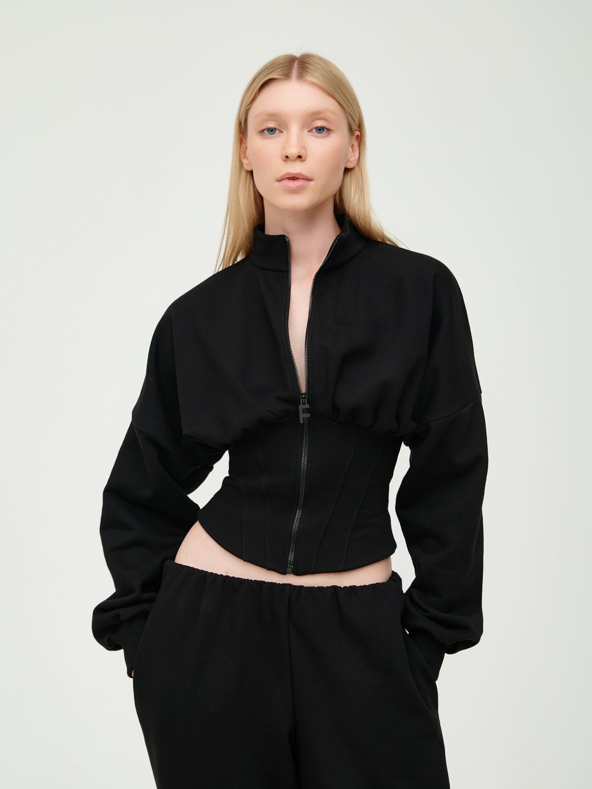 Описание: Кофта свободного кроя на молнии с корсетной зоной, изготовлена из мягкого футера 3-х нитки. Подчёркивает все достоинства фигуры, моделирует тело под форму «песочные часы».