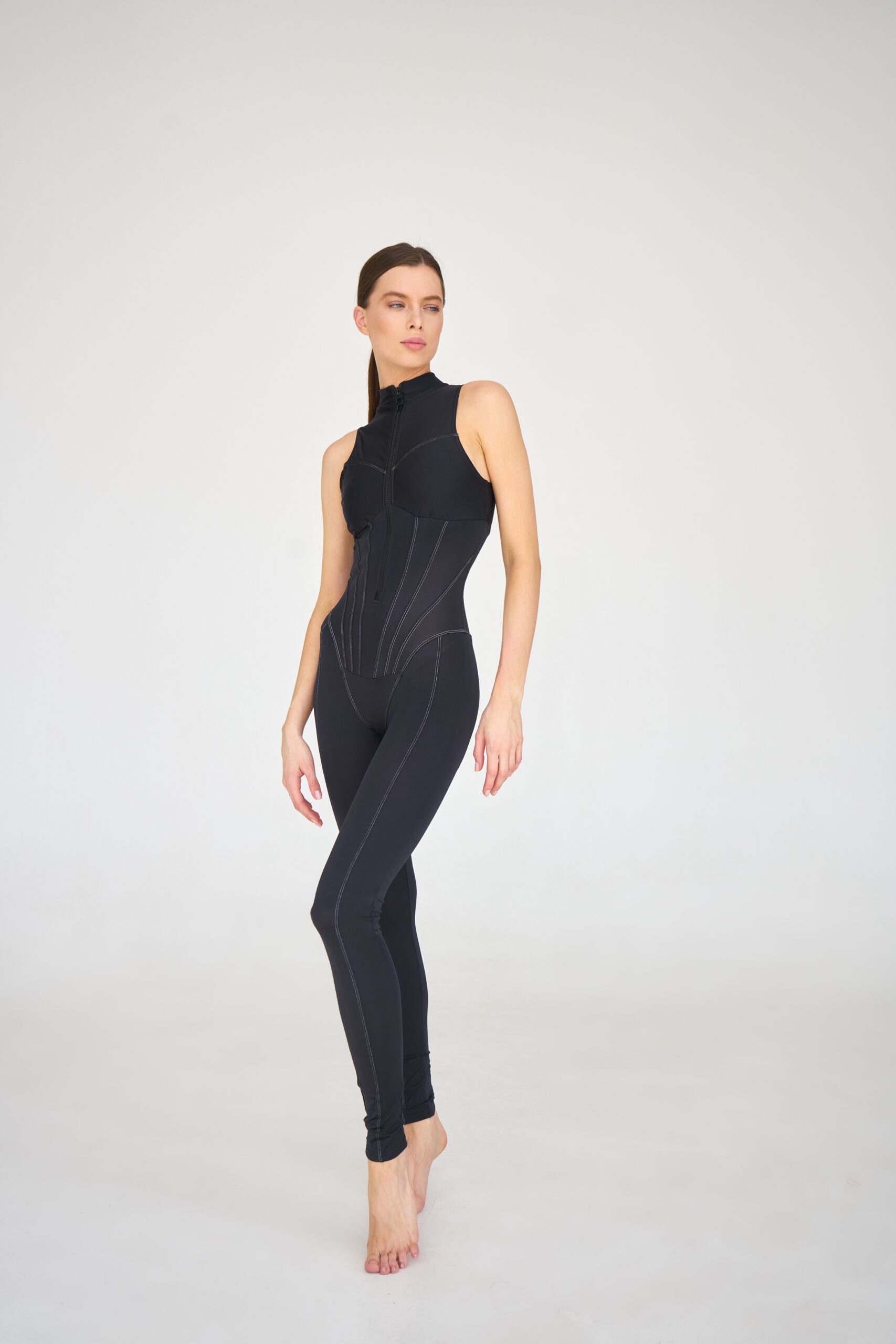 Описание: Моделирующий спортивный нательный комбинезон на молнии с короткими рукавами, легинсами и контрастными строчками, изготовленный из функционального материала. Обладает утягивающим эффектом в зоне талии с помощью встроенного сетчатого слоя и корсетной формы. Моделирует ягодицы с помощью пуш-ап эффекта, подчеркивает грудь. Имеются отверстия для чашечек.